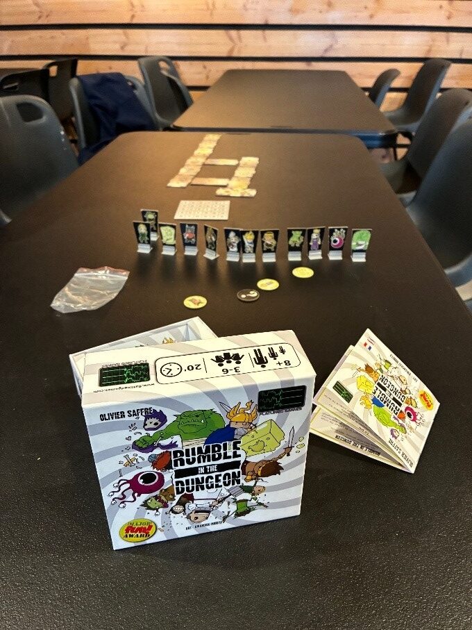 Puis les copains m’ont fait découvrir « Rumble in the Dungeon » un jeu de déduction et de bluff. 12 personnages sont placés dans le donjon que nous créons en début de partie.